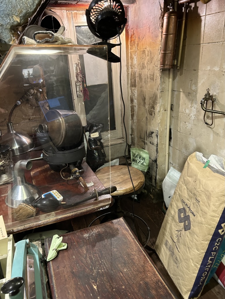 커피 주문하는 방에 잘 보면 구석탱이에 이런 곳이 있는데, 운이 좋으면 여기서 로스팅을 하는 모습을 볼 수 있습니다. 취미로 직화로스팅을 하다 보니 반가웠는데, 저는 귀찮아서 전동 모터를 사용하는데 여기서는 수동으로 드럼을 돌려서 놀랐습니다. 완전 장인이신 듯.