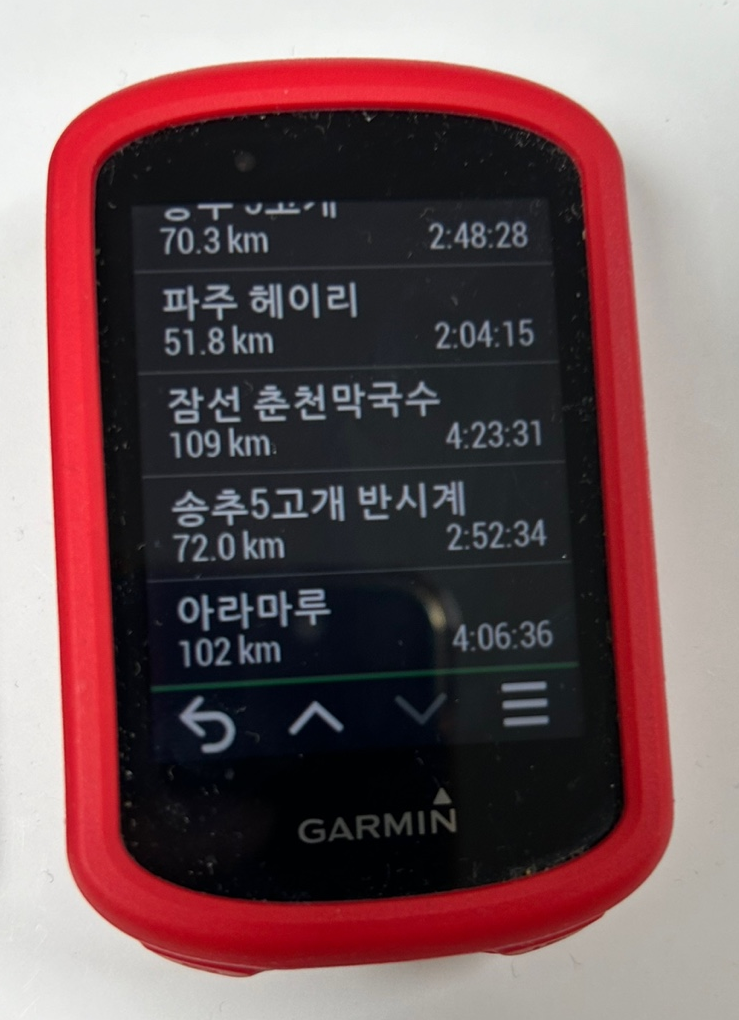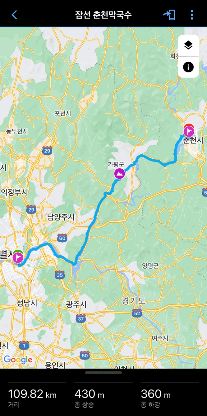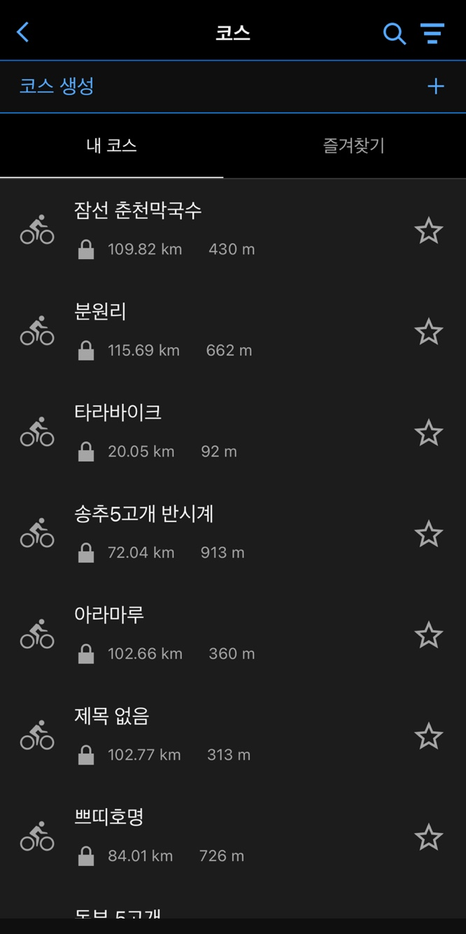 7. garmin connect 앱에서 자세히 → 트레이닝 및 플래닝 → 코스 → 코스 선택 (잠선 춘천막국수ㅎㅎ) → 위쪽 코너에 가민 엣지 버튼 클릭. 가민과 동기화되면 자동으로 옮겨집니다. (안드로이드는 화면이 좀 다를 수 있어요)