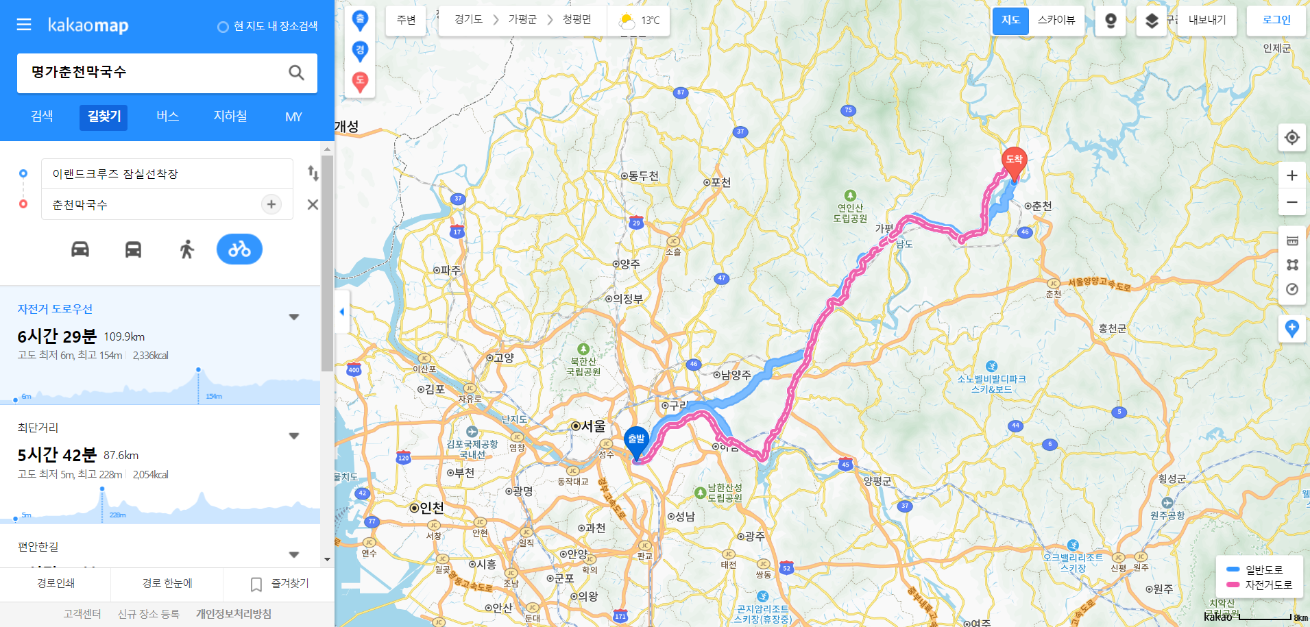 3. 카카오맵에서 원하는 자전거 경로를 선택합니다.