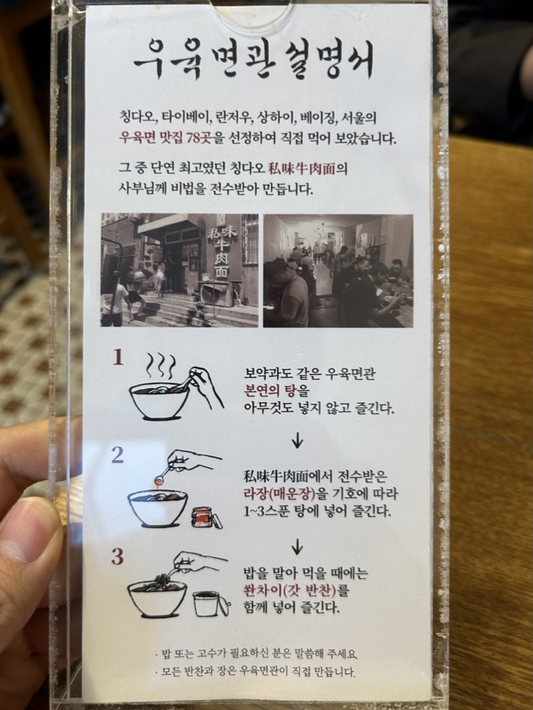 바로 옆에 있는 호랑이도삭면도 가본 적이 있는데 국물은 우육면관이 더 마음에 들었지만, 개인적으로 식감 있는 면을 좋아해서 면 하나는 호랑이도삭면이 더 마음에 들었어요. 도삭면을 좋아하고 우육면 이외에 다양한 음식도 먹고 싶으면 호랑이도삭면, 찐 우육면을 드시고 싶으면 우육면관을 추천해요.