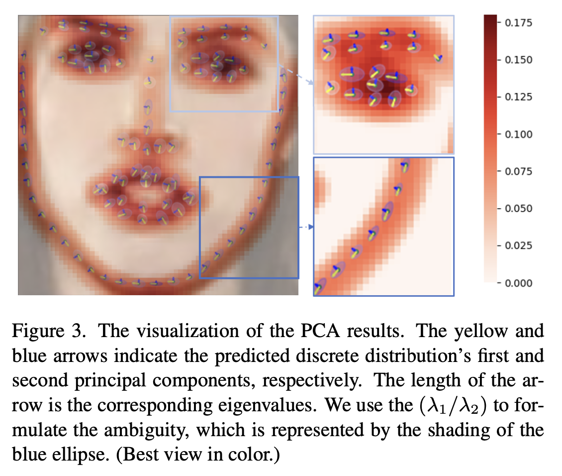 "STAR Loss: Reducing Semantic Ambiguity in Facial Landmark Detection" (github page)이라는 논문에서는 이러한 데이터의 한계점을 극복하는 한 가지 방법으로 STAR loss를 제안하였습니다. 저자들이 아이디어를 얻게 된 배경은 다음과 같습니다 (밑에 그림 참고). facial landmark를 예측할 때 사용되는 heat map의 분포를 보면 (heat map: landmark의 위치를 나타내기 위해서 사용되는 중간 결과) heat map의 분포를 보면, 위치가 애매한 landmark 같은 경우 애매한 방향을 따라서 (예를 들어 얼굴 landmark 같은 경우 얼굴 contour 방향) 표준편차가 높습니다. 반면 눈 코너에 해당되는 46번 landmark 같은 경우 상대적으로 명확하기 때문에 isotropic gaussian 같은 분포를 보입니다.