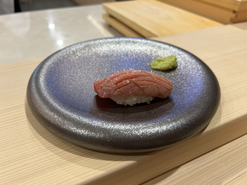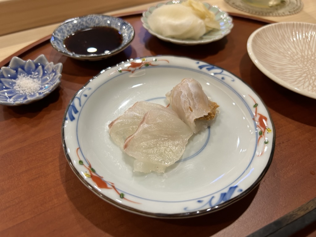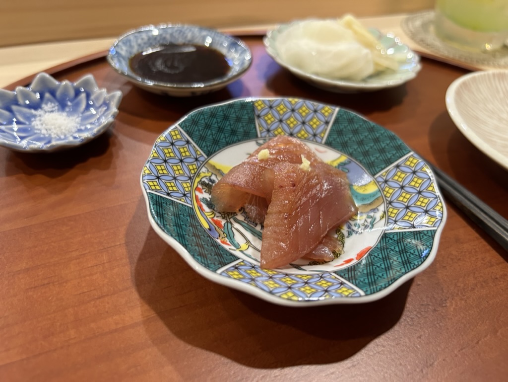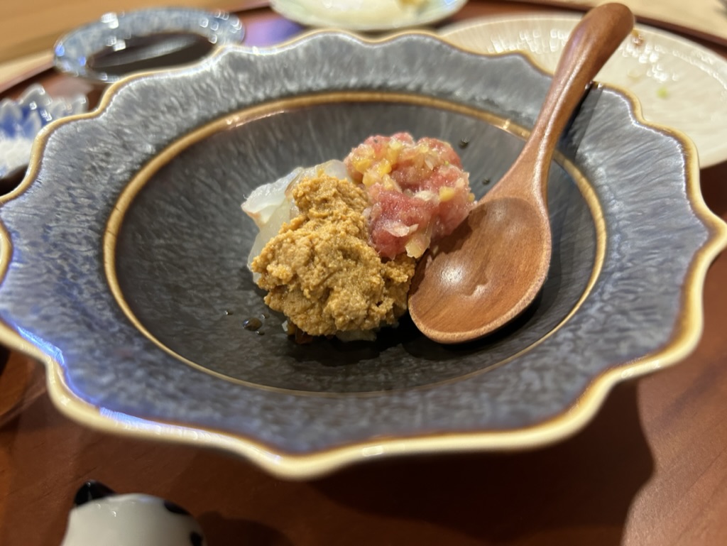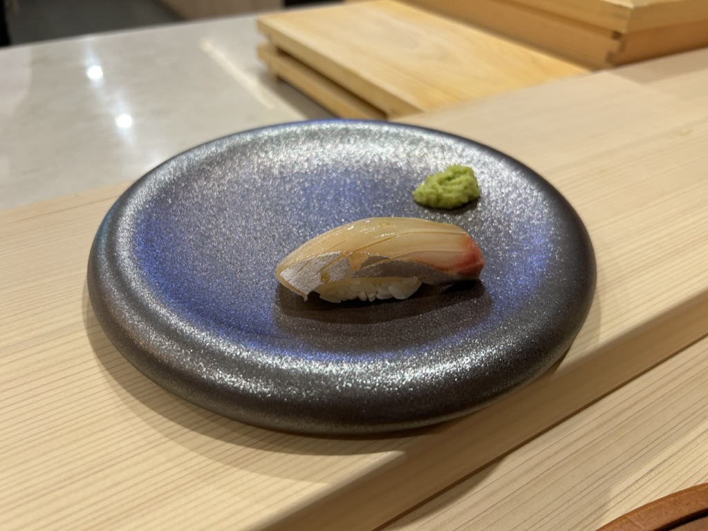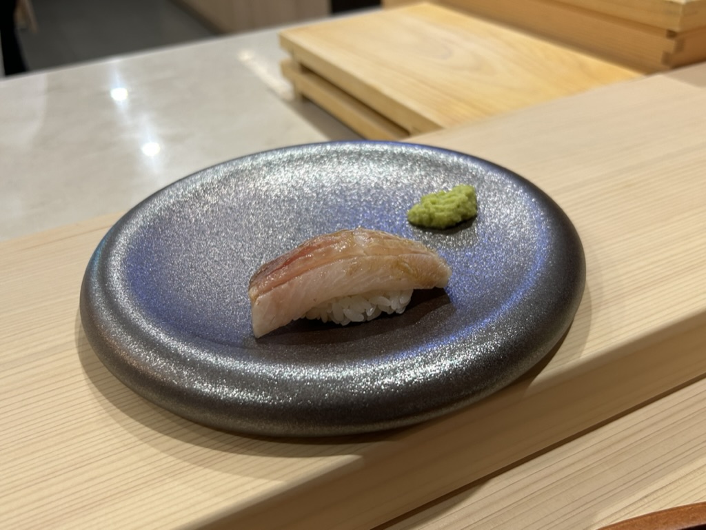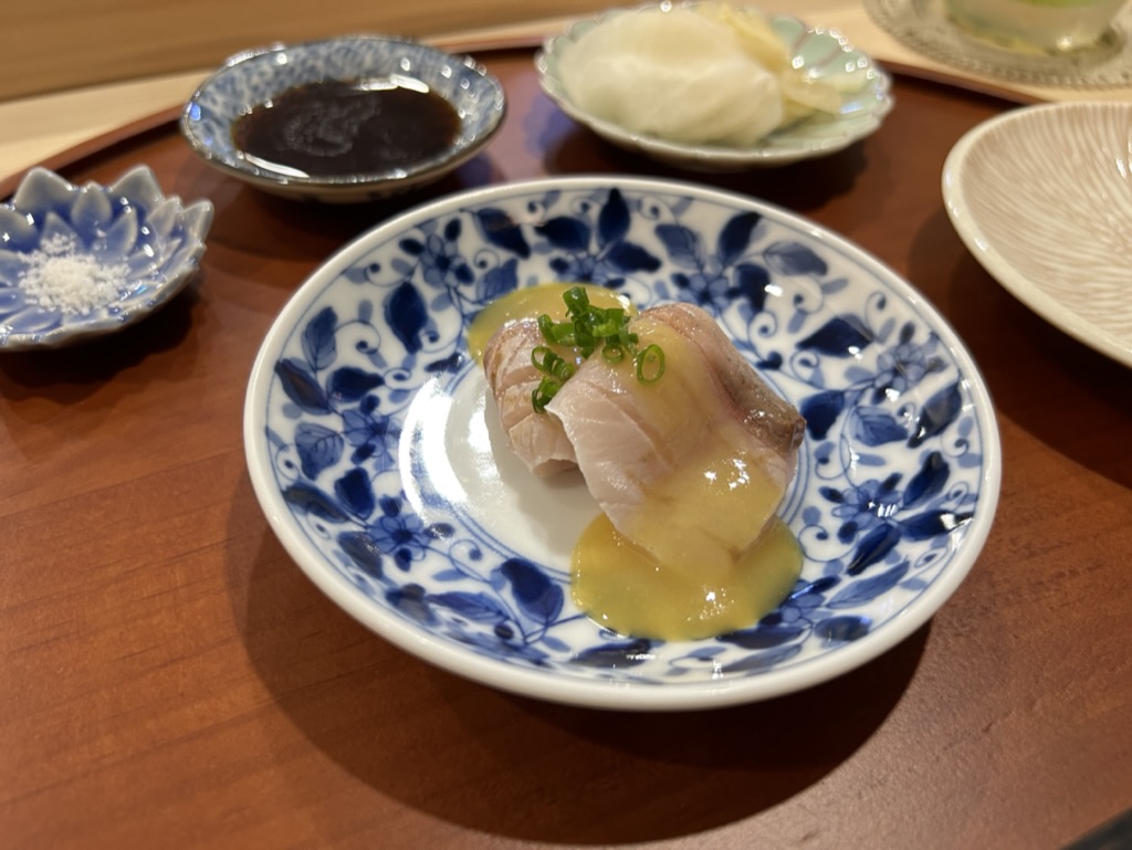 특히 기억에 남는 것은 잿방어인데 맛있어서 앙콜로 한번 더 먹었기 때문에 기억하고 있어요. 이 메뉴는 토치를 사용해서 그을림 향이 추가되었고, 위에는 미소된장으로 만든 소스가 올라가 있어 아주 맛있었습니다. 전에는 못 봤었던 메뉴인데 아마 제철에 가야 먹을 수 있을 거예요.