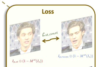 여기서 \( 1-M^{st}\)는 어깨 부분에 해당하는 mask입니다. 따라서 \( L_{st,const}\)는 self reconstructed image \( I_{p,recon} = D(W(f_s; x_s, x_s)) \) 와 stitching해서 생성한 이미지 (I_{p,st} = D(W(f_s; x_s, x'_{d,st})))가 어깨 라인에 차이가 없도록 constraint를 주는 objective라고 생각하면 됩니다.