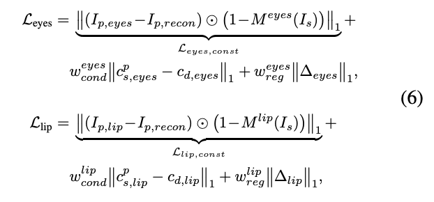 그리고 다음과 같이 loss function을 사용합니다. 여기서 \( 1-M^{eyes/lip}\)는 눈/입이 아닌 부분을 의미하기 때문에 눈 / 입이 아닌 부분은 retargeting network가 건들지 않도록 constraint를 건 것이라 생각하면 됩니다.
