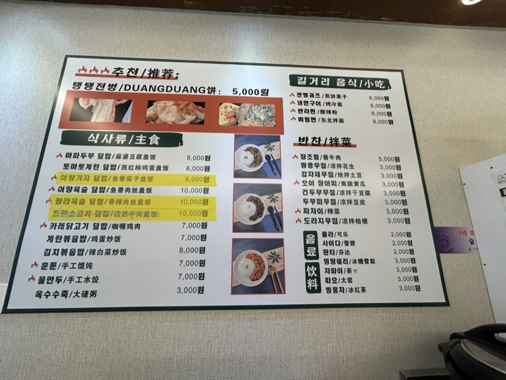 쯔란소고기 덮밥이 정말 맛있을 것 같은데 더 이상 안 파는 것 같아요ㅜㅜ 탱탱 전병은 자주 품절이 되어서 못 먹을 수도 있는데, 겹이 많은 (약간 난 같은) 빵이에요. 어향육슬 덮밥 같은 거 주문해서 소스랑 같이 먹으면 맛있어요. 매장에서는 못 먹어봤고, 집에서 배달시켜먹어 봤는데, 탱탱전병 양이 상당히 많아서 남았었는데, 냉장고에 넣었다가 나중에 마트에서 파는 인도 커리나 유러피안 커리 같은 것에 찍어먹으면 정말 잘 어울립니다.