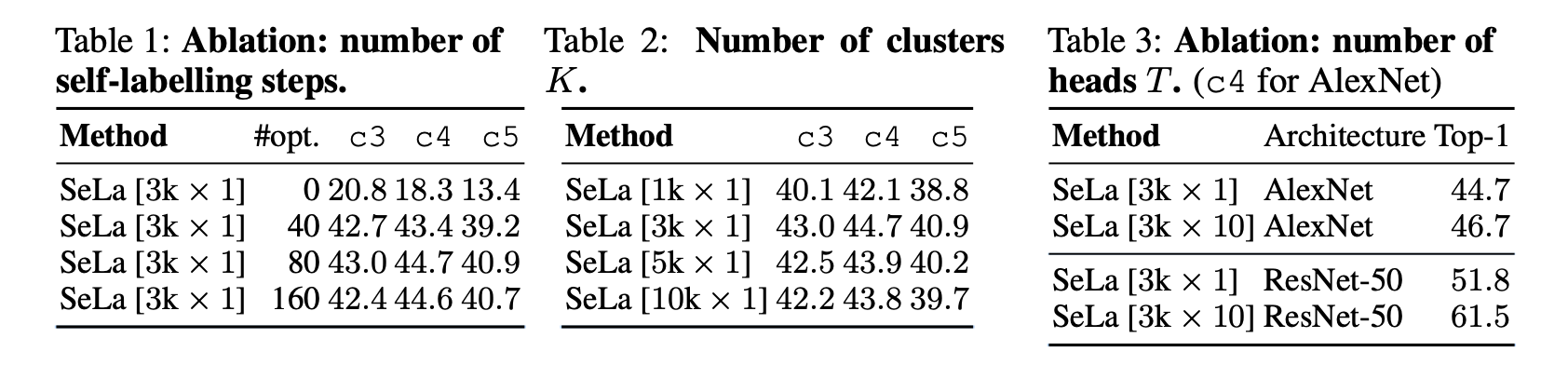 - Self labeling steps: step 1과 step 2의 비율은 1:2정도가 적당했다고 한다 (step 1을 160번 반복했을 때) (table 1; #opts가 학습할 때 step 2를 반복한 수)