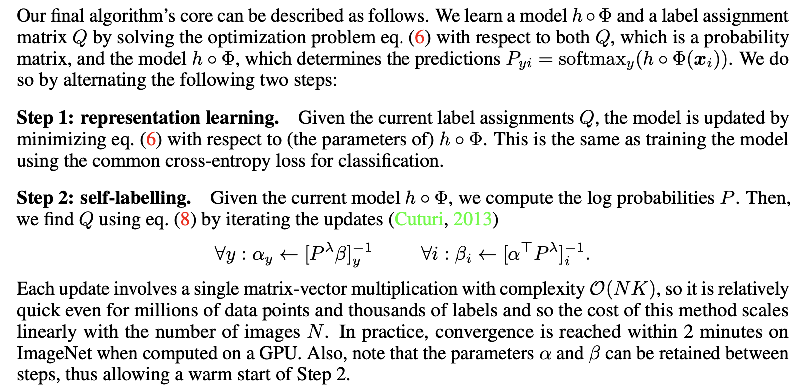 참고로 step 2에서 Sinkhorn-Knopp 알고리즘을 돌려서 Q를 찾고 이것을 step 1에서 사용한다고 적혀있는데 실제로 코드를 보면 step 2에서 Q를 찾고, 이 Q에서 각 data가 가장 높은 확률로 갖는 label을 찾는 방식으로 discrete label을 얻는다 (해당 깃헙 코드 링크: https://github.com/yukimasano/self-label/blob/609bd5842633ec9933b936a3a37323f40d4528fa/sinkhornknopp.py#L136)