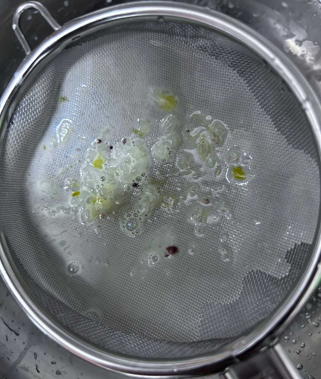 6. 5에서 만든 커스터드 배이스에 덩어리들이 있을 수 있기 때문에 한번 걸러줍니다 (사진 혐오 주의...)