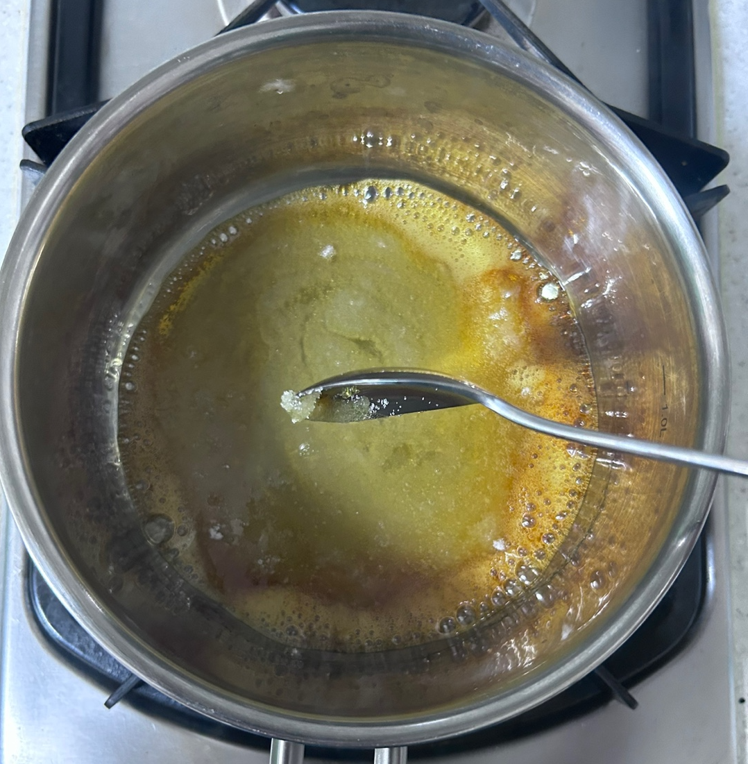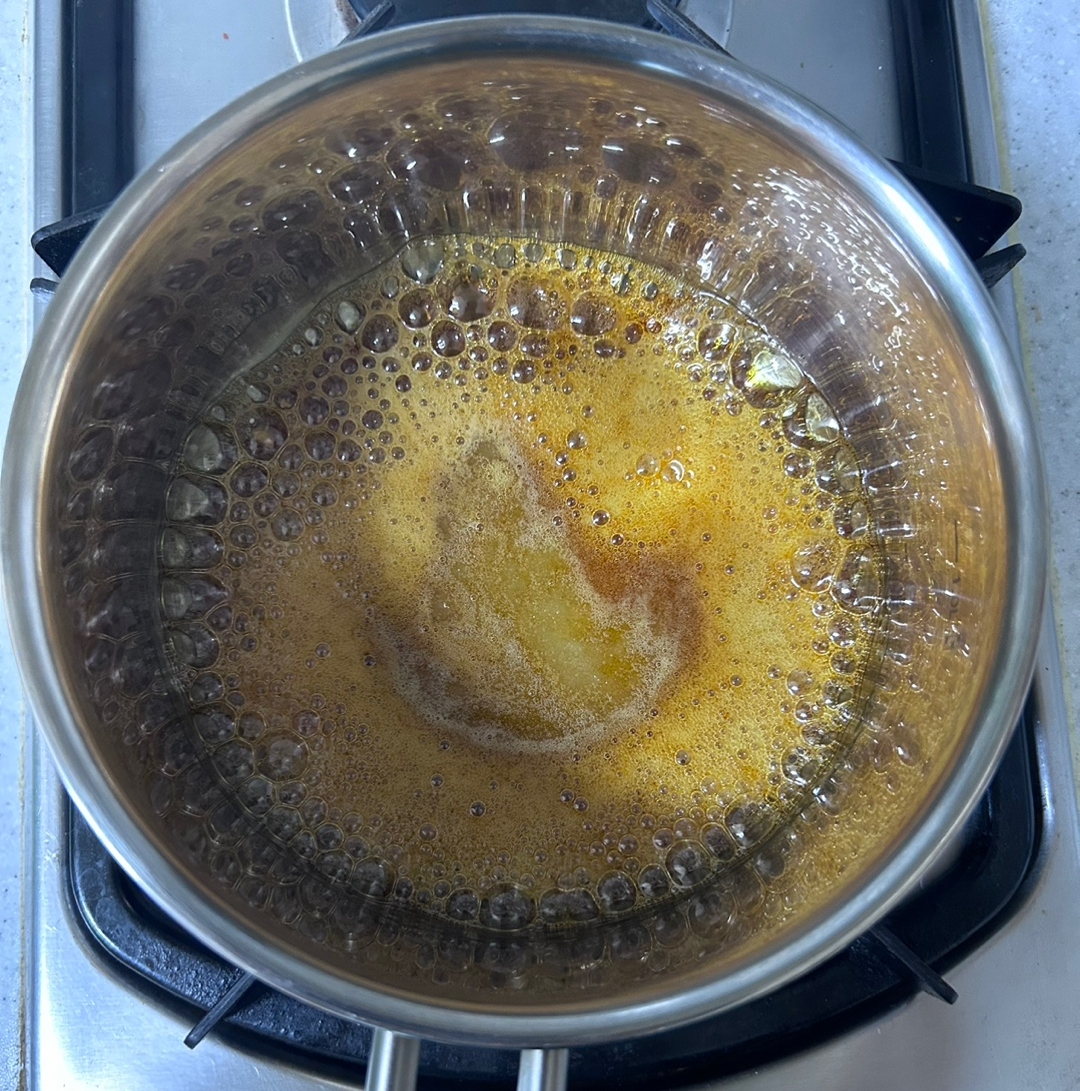 2. 작은 냄비에 설탕 6큰술과 레몬즙 4방울을 섞어서 약~중불에 녹여줍니다. 레몬즙을 넣어주먼 crystallization (설탕을 녹일 때 서로 뭉치는 현상)을 방지해 주는 효과가 있습니다. 저는 설탕이 살짝 녹기 시작할 때 한번 섞어줬습니다. 캐러멜이 되면 버터를 바른 커스터드 컵에 4 등분해서 담아줍니다.