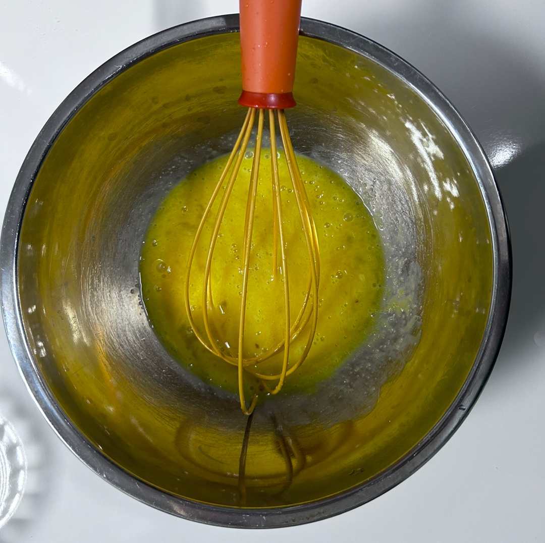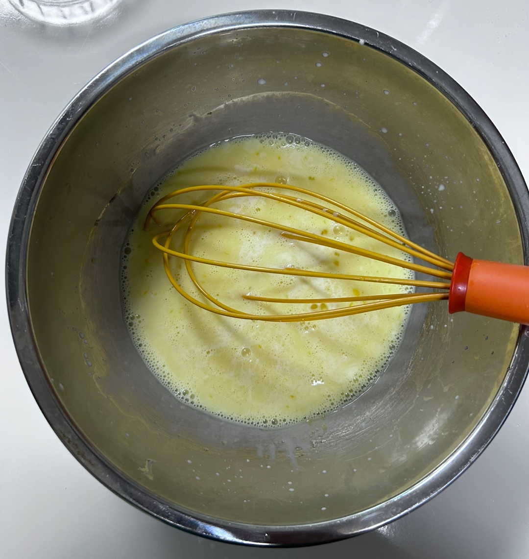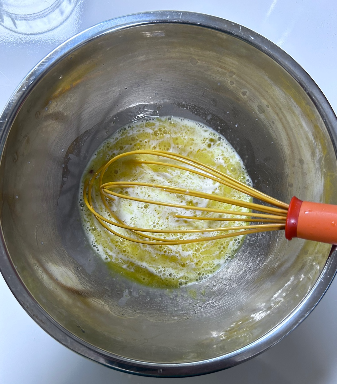 5. 끓인 (크림+우유+설탕)을 (계란+설탕+바닐라)에 천천히 부어주면서 섞어줍니다. 이때 너무 빨리 부어버리면 계란이 빨리 익으면서 뭉쳐버립니다. 이렇게 되면 식감이 안 좋아질 수 있기 때문에 주의합니다.