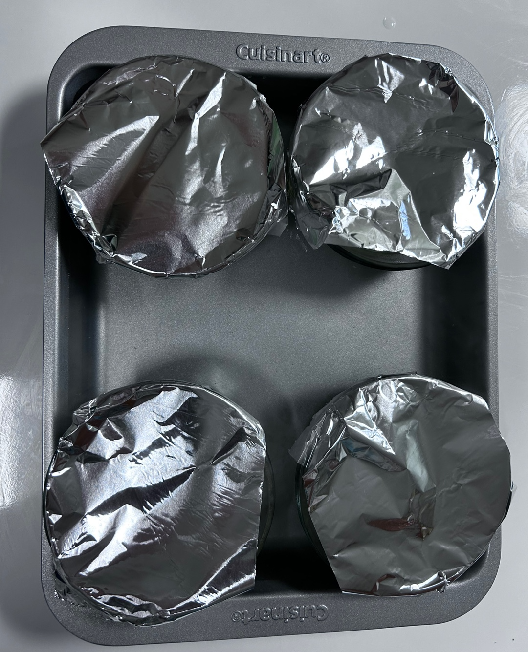 8. 알루미늄 포일로 컵들을 덮어씌워줍니다 (열선과 너무 가까우면 표면이 탈 수 있습니다). 그리고 중탕을 하기 위해서 다음과 같이 끓는 물을 부어줍니다.