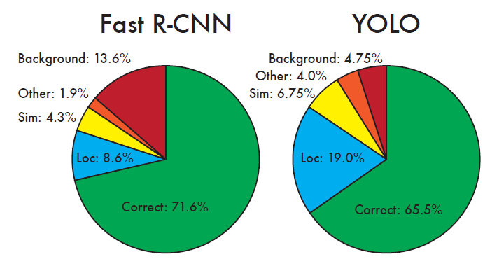 - 학습할 때 w, h에 square root을 취하는 trick을 사용하기는 하였지만, 작은 물체에 작은 오류가 큰 영향을 주는 문제는 여전히 해결이 안 됨. 이런 오류들 때문에 잘못된 localization이 많음 (밑에 참고)