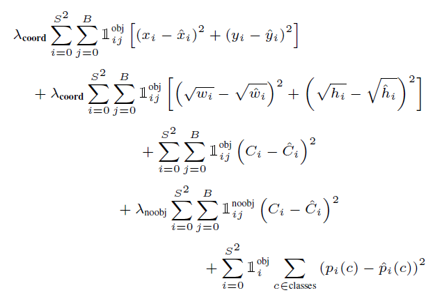 - \( \mathbb{1}^{obj}_{ij}\): cell i의 j번째 bounding box가 물체를 감지하는 것을 담당할 때만 1, 나머지 경우는 0인 함수입니다. 여기서 담당 기준은 예측된 bounding box가 실제 bounding box와 IOU 가 가장 큰 경우가 됩니다.