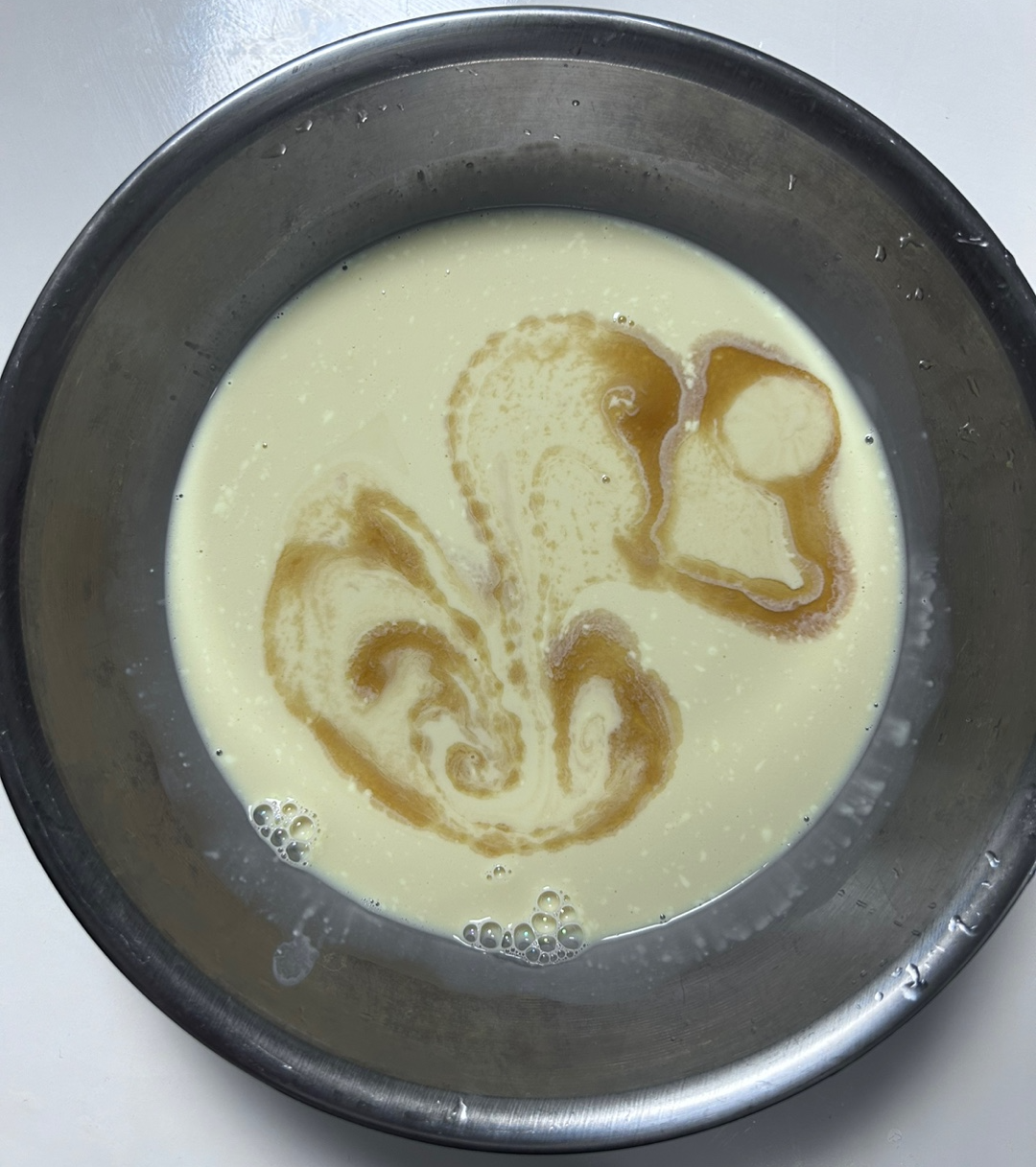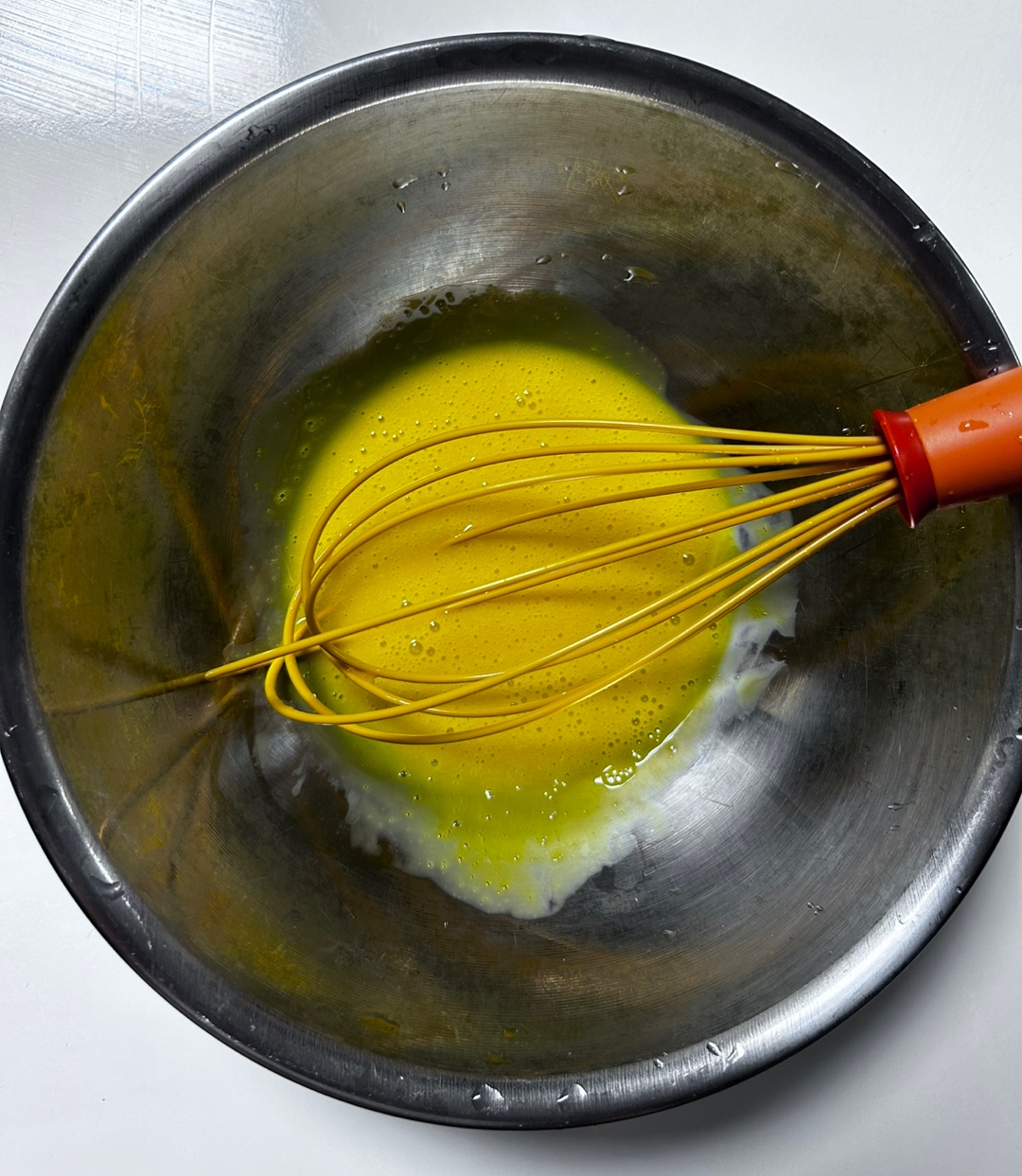 3. 계란 노른자에 뜨거운 우유+휘핑크림을 조금씩 섞어줍니다 (저어주면서 조금씩 부어주세요). 이때 우유+휘핑크림을 너무 빨리 부어버리면 계란 노른자가 굳어버릴 수 있기 때문에 주의해 주세요.