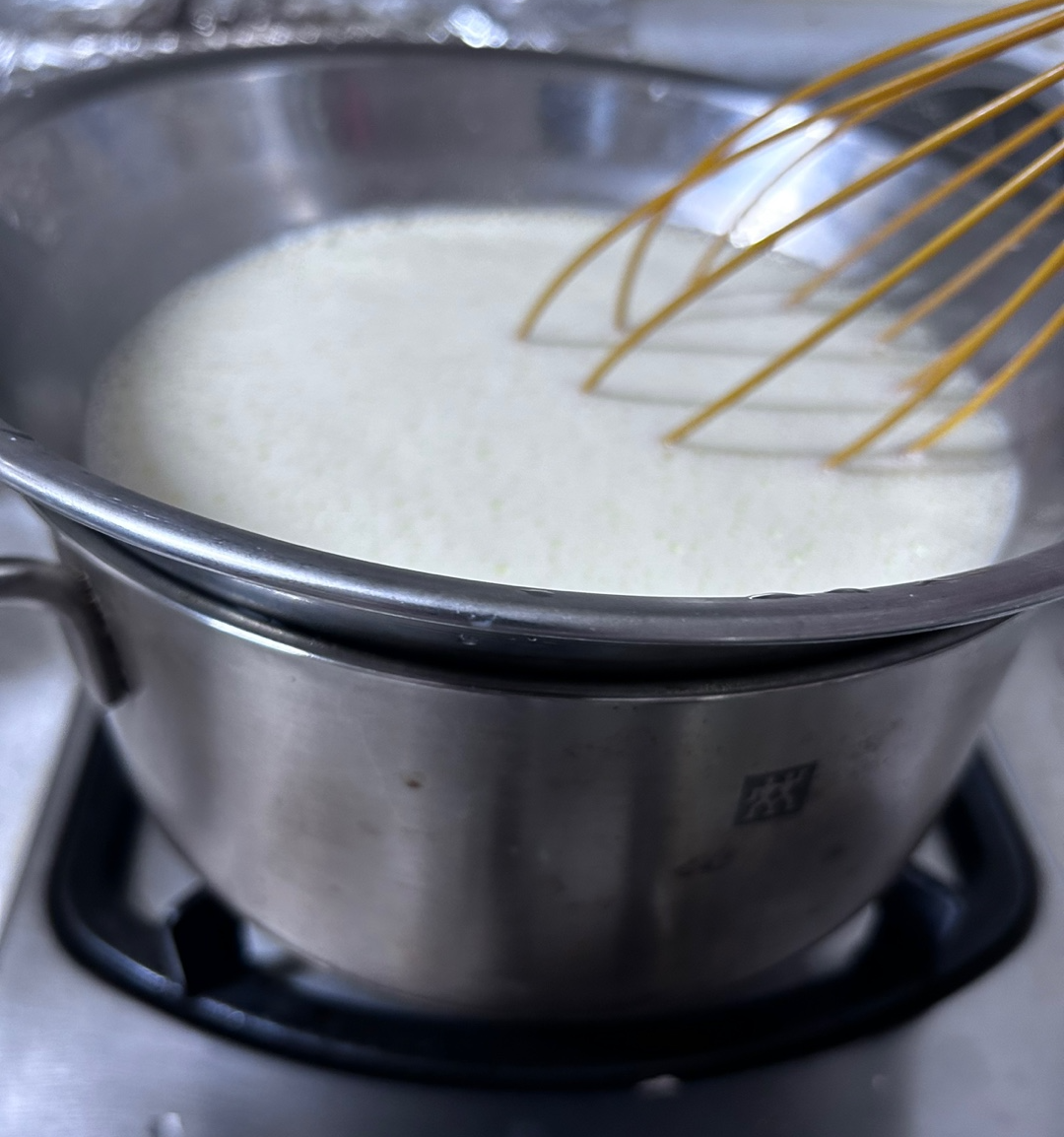 4. 3에서 만든 계란+우유+크림을 가열해 주세요. 냄비에 담아서 가열해도 되지만 잘못하면 온도가 너무 높아질 수 있기 때문에 double boiler 기법 (끓는 물이 담긴 냄비 위에 용기를 얹어서 가열한다는 뜻) 사용하면 좋아요. 섭씨 85도 정도까지 가열하면 돼요 (처음 만들 때 꿀 아이스크림 레시피처럼 냄비에 넣고 그냥 가열했다가 실패했었어요. 꿀 아이스크림 레시피에서는 꿀과 같이 가열하는데, 동과 시럽을 같이 가열하면 딱히 맛있는지 잘 모르겠어서 저는 식힌 후 추가했어요.)