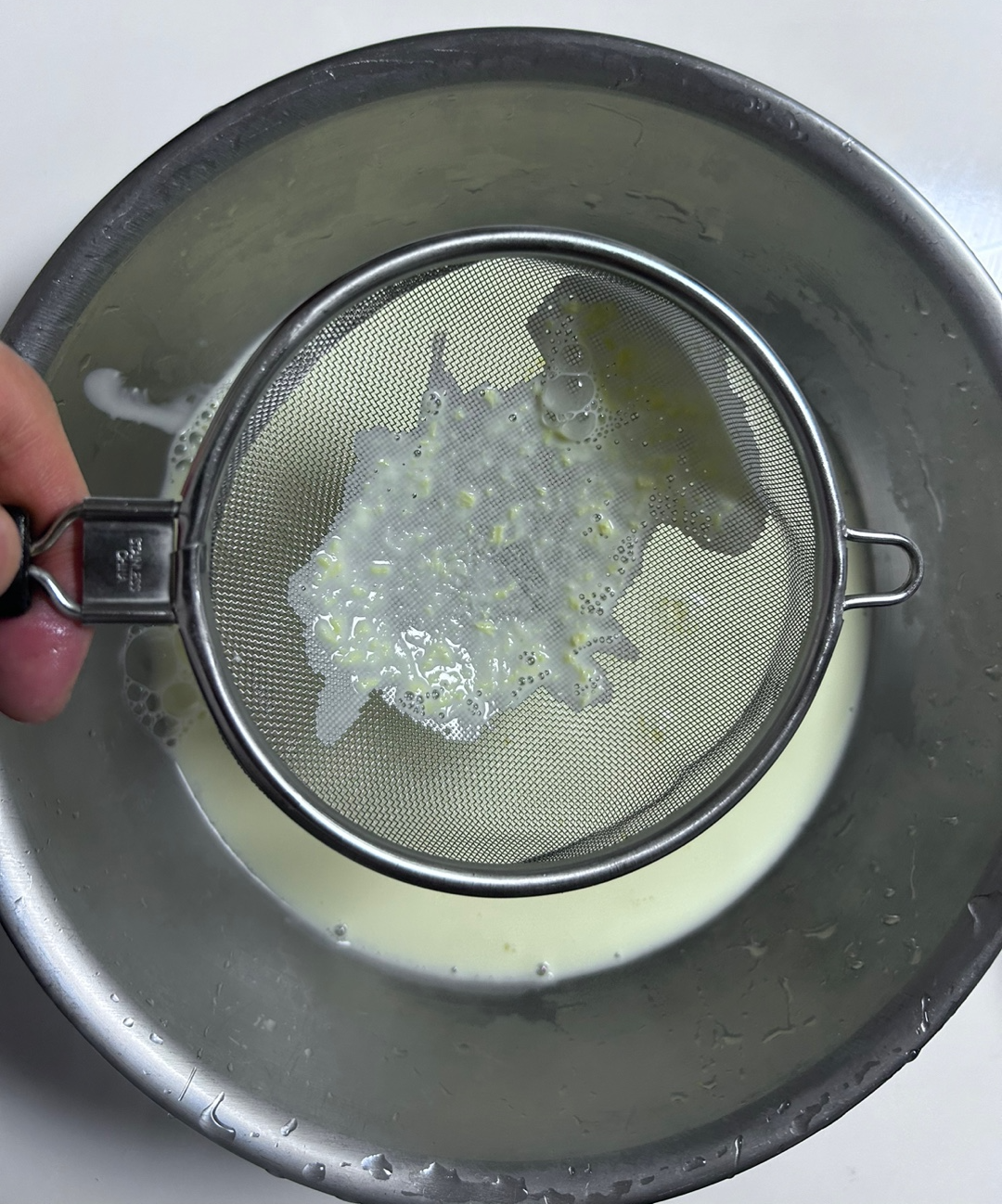 5. 85도가 되면 가열을 멈추고 체를 사용해서 걸러줍니다 (계란이 굳으면서 건더기? 가 생길 수 있어요. 꼭 걸러주세요.)
