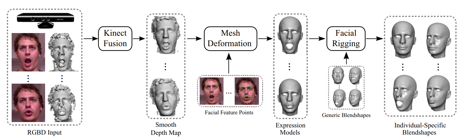 - 3D data의 noise를 줄이기 위해서, 고개를 돌리는 데이터들을 기반으로 Kinect Fusion algorithm을 사용해서 각 표정에 대한 3D 데이터 수집한다 (noise가 적은 얼굴의 depth 정보를 수집한다는 의미)