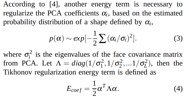 - 얼굴 shape 정보가 Blanz & Vetter에서 얻은 데이터 distribution과 너무 차이 나지 않게 하기 위해서 다음과 같은 regularization term을 추가한다:
