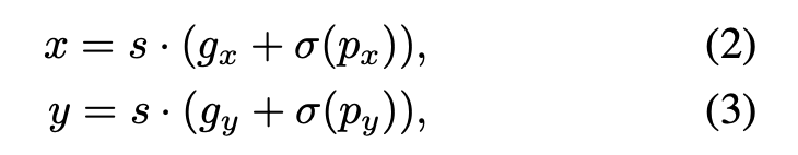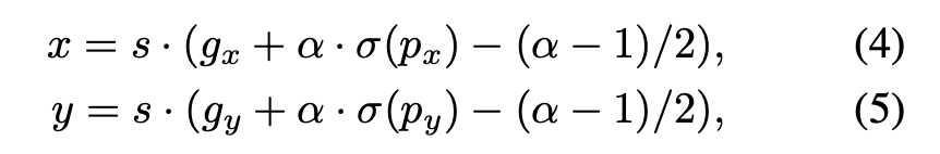 - Grid Sensitive: YOLO-v4에서도 다뤘던 문제다. YOLO-v3에서는 밑에 식 2,3을 사용해서 bbox의 center x,y를 찾는다. 하지만 sigmoid 특성상 grid point 근처에 bbox center이 있으면 예측하기 어려워진다. 그래서 식 4,5같이 바꿔주고 alpha=1.05를 사용했다고 한다