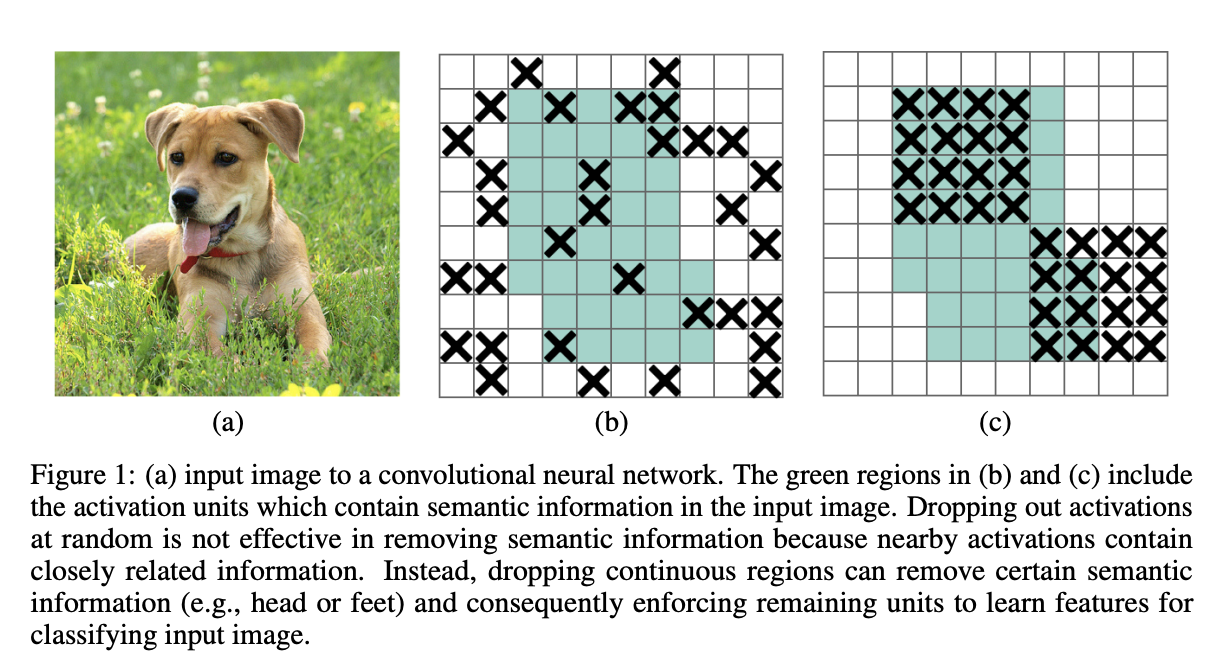 - DropBlock: 밑에 그림처럼 feature map에서 완전 랜덤하게 drop out하지 않고 block들을 drop out하는 regularization 방법. Backbone에 추가하면 성능 저하가 있지만 feature pyramid에 추가하면 성능이 좋아졌다고 한다. 사용하는 구체적인 위치는 Figure 2에서 삼각형으로 표시되어 있다.