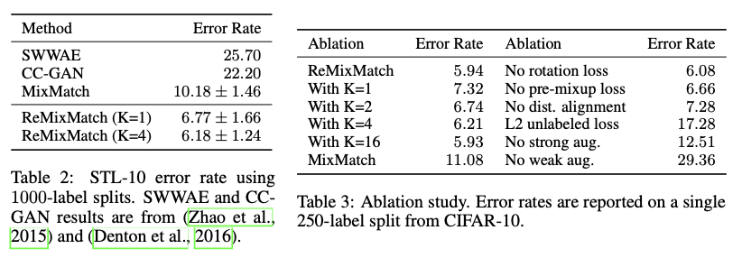 개요 논문 링크: https://arxiv.org/abs/2001.07685 이전 글: [논문 리뷰] ReMixMatch [논문 리뷰] Unsupervised Data Augmentation for Consistency Training semi-supervised learning 논문. 복잡해지는 semi-supervised training방법들에서 중요한 요소들을 잘 통합해서 간단하지만 성능이 좋은 방법이라고 저자들은 설명한다. 간단히 요약하자면 consistency regularization과 pseudo-labeling을 같이 사용하는 semi-supervised training 방법이라고 이해하면 된다. 방법 Notation L: 데이터셋에 class 수 B: batch size (labeled ..